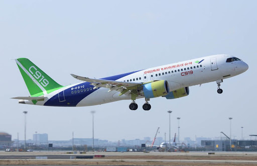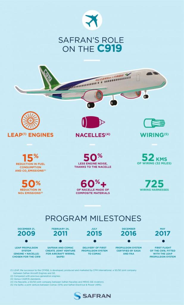 El COMAC C919 es un bi reactor de ala baja, de fuselaje estrecho con un solo pasillo de corto y medio alcance diseñado y fabricado en China por la empresa COMAC, cuyo equivalente en inglés es (Commercial Aircraft Corporation of China Ltd.), con una capacidad de entre 156 y 168 pasajeros, con la colaboración de empresas occidentales para algunos de sus componentes, como vemos en la fotografía inferior, motorizado por dos turbo ventiladores, nuestro conocido CFM International LEAP-1C, con un empuje unitario de 137,9 kN, ó ACAE CJ-1000A de desarrollo chino, con una autonomía de vuelo de 5.555 kilómetros