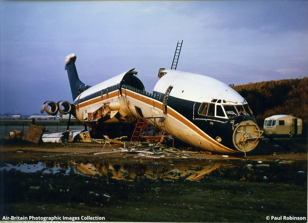 El 28 de Enero de 1972, el VC10 de British Caledonian, con registro G-ARTA, resultó accidentado durante la toma de tierra en el aeropuerto londinense de Gatwick, tal y como observamos en la imagen superior, afortunadamente sin perdida de vidas, y cuyos restos fueron trasladados al desguace.