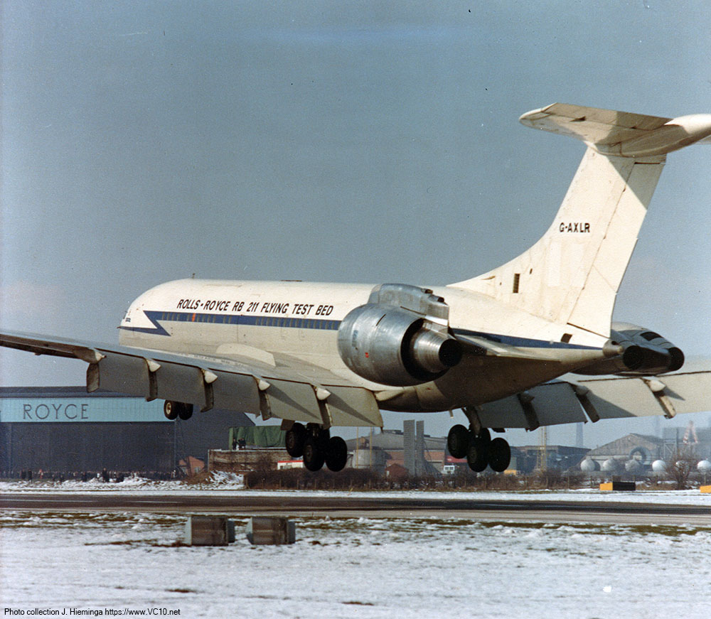 Uno de los aparatos, el XR809, con registro G-AXLR, fue cedido a Rolls Royce para utilizarle como banco de pruebas del nuevo turbo ventilador RB211 entre 1969 y 1975, tal y como observamos en la imagen superior. En 1977, fueron convertidos en aeronaves de re abaste-cimiento en vuelo mediante la instalación de tanques de combustible en su interior en dos versiones distintas los VC10 K2 con una capacidad de 77 toneladas y los VC10 K3 de 82 toneladas de combustible, cuya conversión fue realizada por British Aeroespace en Filton, cuya imagen vemos mas abajo.