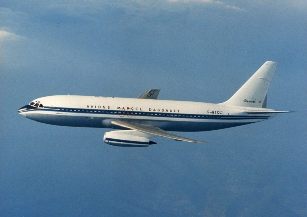 Y así poder conquistar la aviación comercial, tal y como ya controlaba la de combate, con la fabricación de los exitosos Dassault Ouragan, Dassault Mystère, los mas modernos Dassault Mirage III, F1, como el de fotografía superior y el 2000. Marcel Dassault, fundador y propie-tario de la empresa escogió en nombre de Mercure en pos del dios griego mitológico, Mercurio. Se utilizaron las herramientas y sistemas de computación más modernos de la época en su diseño, con la particularidad que era más rápido que la del competidor norte-americano a batir, en parte debido a su mayor superficie alar.
