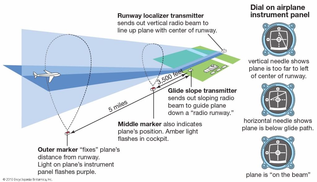 Los aeropuertos pueden ser clasificados en tres categorías diferentes según la altura para la cual el piloto toma la decisión de tomar tierra o nó. CAT 1 con una visibilidad de 200 pies (61 metros) y 600 metros de decisión visual de la pista, CAT 2, con visibilidad de 100 pies (30,50 metros) y 400 metros de visión de la pista y CAT 3 con visibilidad cero, dirigidos a la pista de aterrizaje a través del ILS ó Instrument Landing System, Sistema Automático de aterrizaje, en castellano, mediante sensores colocados en la aeronave así como radio balizas instaladas en tierra, la primera, la baliza exterior situada a 8.046 metros (5 millas), la segunda ó la baliza intermedia situada a 1.067 metros, (3.500 pies) de la cabecera de la pista de aterrizaje donde se encuentra el transmisor que controla el ángulo de descenso del aparato y finalmente el localizador y transmisor de la pista, localizado al final de ésta, de tal forma que los pilotos solo tengan que aplicar la reversión de motores, para reducir la velocidad, y realizar el carreteo a la terminal, cuyo esquema de funcionamiento encontramos mas abajo, en la parte derecha vemos los instrumentos instalados en el aparato y a la izquierda su funcionamiento.