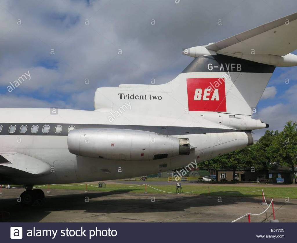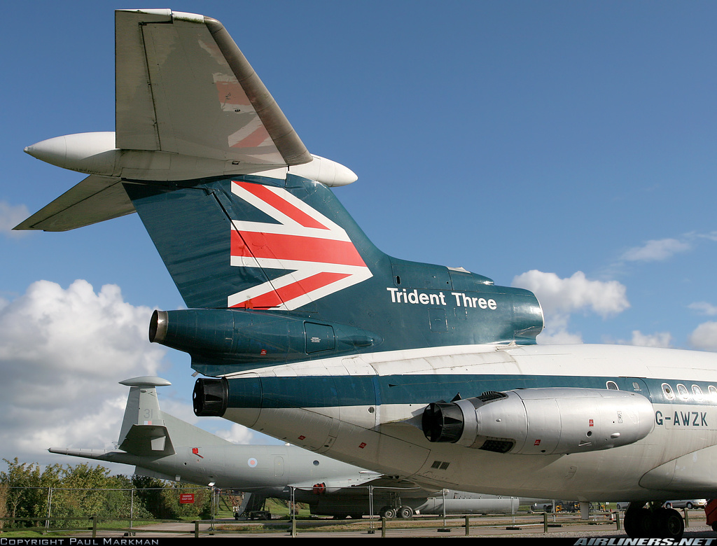 El Hawker Siddeley HS 121 Trident, fue el primer tri reactor británico de ala baja, de corto y medio alcance, con un solo pasillo y fuselaje estrecho, con cola en forma de T y sus motores situados a ambos lados en la parte posterior del fuselaje y el tercero sobre el éste, en la base del empenaje vertical, como vemos en la imagen superior. Originalmente designado como de Havilland D. H. 121 y Airco DH121, siendo el primer aparato en servicio en realizar un aterrizaje con visibilidad cero en 1965, tan necesario en Reino Unido debido a sus espesas y persistentes nieblas. Este aparato fue la respuesta británica de la compañía estatal British European Airways (BEA) para sus rutas europeas con la adquisición de una generosa flota para la cobertura de todas sus rutas. Debido a la racionalización y fusiones de los distintos fabricantes aeronáuticos británicos impuesta por el gobierno. Entró en servicio dos meses más tarde que su competidor estadounidense, el Boeing B-727, con la misma configuración de sus plantas motrices, como vemos mas abajo, perdiendo la oportunidad de haber conseguido algunos clientes potenciales.