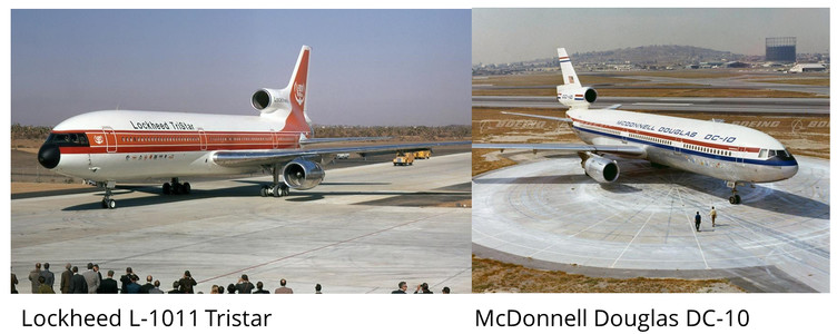 El Douglas/McDonnell Douglas DC-8 es un reactor cuatrimotor norteamericano de ala baja, fuselaje estrecho con un solo pasillo de medio y largo alcance, fabricado entre 1958 y 1972 por Douglas Aircraft Company, para competir con el Boeing B-707, cuyos detalles podemos leer en éste mismo blog. Douglas estaba mejor posicionado en la construcción de aeronaves de pasajeros que Boeing, éste último especializado en la construcción de aparatos militares. Ambos fueron sustituidos por los nuevos aviones de fuselaje ancho de la época, como el Boeing , B-747, el McDonnell Douglas DC-10 y Lockheed L-1011 TriStar, cuyos dos últimos representantes vemos abajo.