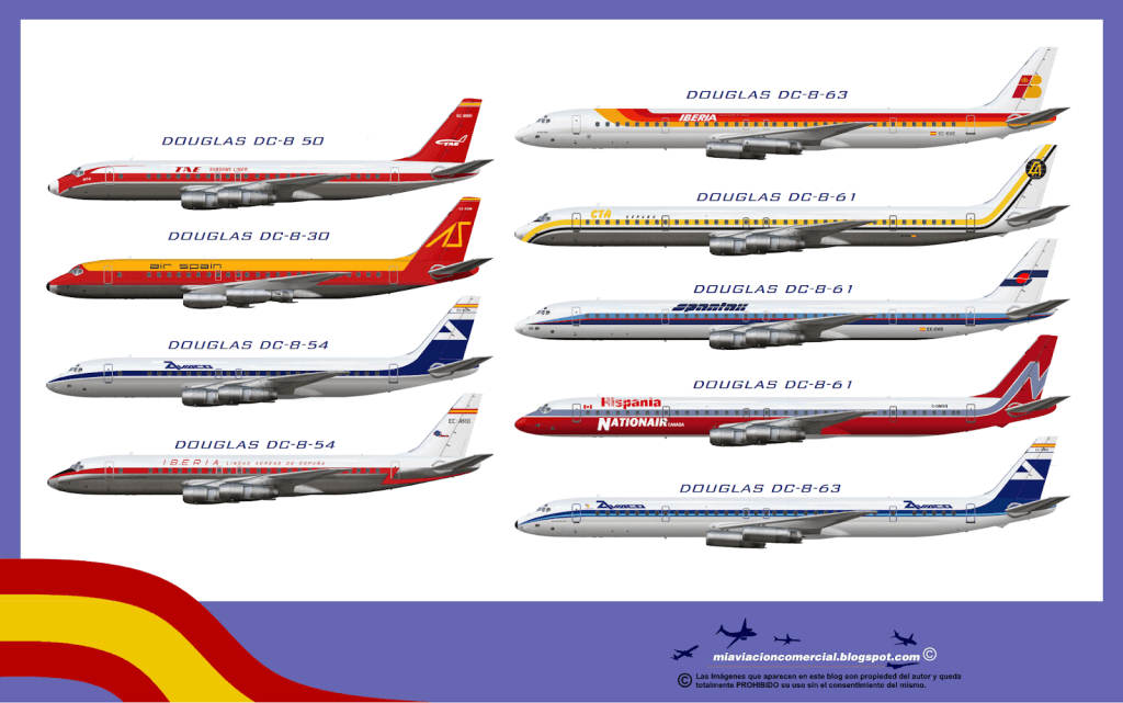 14. Distintas versiones del DC-8, operados por lineas aéreas españolas.