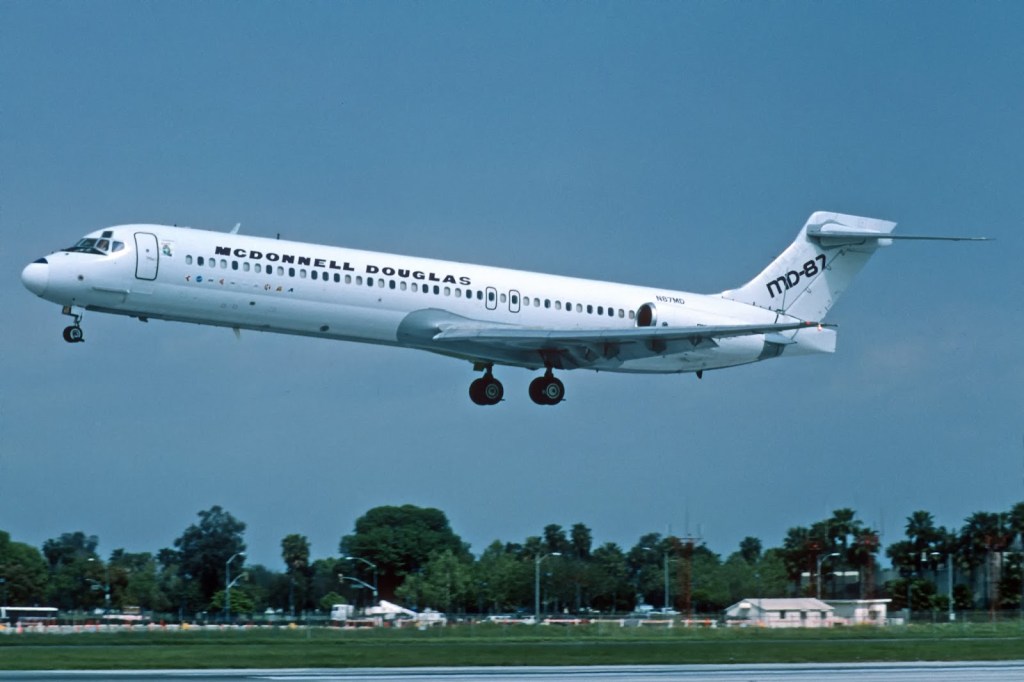 El MD-87 o DC-9-87, fue la versión corta de éste modelo, anunciado en 1985, para transportar entre 109 y 130 pasajeros, con la previsión de entrar en servicio en 1987. Tenía una longitud de 39,75 metros, 5,28 metros más corto que los otros miembros de la familia. Las modificaciones realizadas incluían un alargamiento en la parte superior del empenaje vertical, por encima de los estabilizadores y un mejorado cono de cola, más aerodinámico y agudo, tal y como vemos en la fotografía superior. Estuvo motorizado por dos JT8D-217C de 89 kN de empuje unitario o los JT8D-219 de 93 kN.