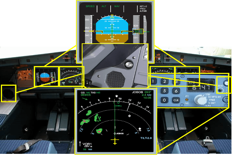 La Unidad Auxiliar de Potencia ó APU, (Auxiliary Power Unit), en su acepción inglesa fue una Garret GTCP85-98D, en todas las series del MD-80, como la que vemos en la imagen superior. Este dispositivo es el encargado de abastecer de electricidad a los sistemas de vuelo, iluminación de la aeronave y arranque de los motores cuando se encuentra estacionado en tierra. El peso máximo de despegue de ésta versión fue de 64.000 kilos, tenía una capacidad de combustible de 21.000 litros, con una autonomía de vuelo de 2.900 kilómetros y 155 pasajeros. La tripulación de los MD-80, en su cabina de mando estaba integrada por piloto y copiloto como del modelo del que derivaba, nuevos sistemas de vuelo y sucesivas mejoras fueron introducidas en los modelos posteriores, tales como las nuevas pantallas EFIS, en sustitución de los clásicos diales, el sistema anti colisión conocido como TCAS, la detección de la temida cizalladura, ó cambio repentino de la dirección del aire a baja altura entre otros sistemas, cuya estampa vemos en la fotografía inferior.