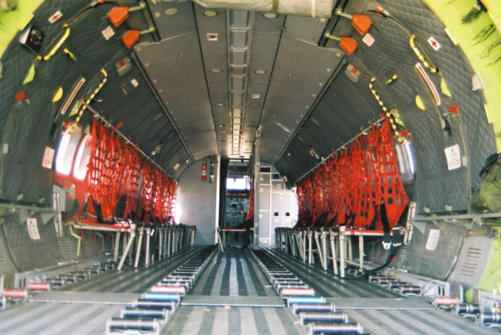 El Boeing C-17 Globemaster III es un tetra reactor militar de carga norteamericano de ala alta propulsado por 4 turbo ventiladores Pratt & Whitney F117-PW-100, con una potencia unitaria de 180 kN, desarrollado para la fuerza aérea norteamericana, USAF, para sustituir al Lockheed C-141 Starlifter y complementar al Lockheed C-5A Galaxy. Su tripulación está integrada por piloto, copiloto y un jefe de carga. Tiene una bodega de 27 metros de largo, 5,5 metros de ancho y 3,76 metros de alto. El suelo dispone de ruedas para deslizar los palés con facilidad pero puede convertirse en suelo plano para el transporte de vehículos, u hospital volante, como vemos en la imagen inferior ó transporte de tropas.