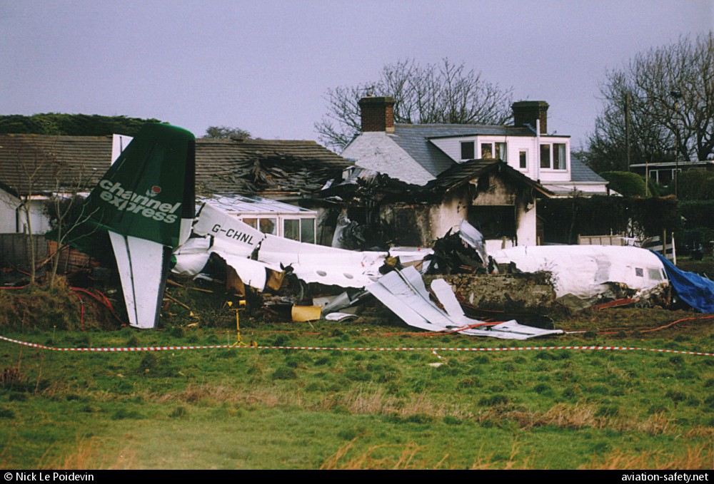 El 12 de Enero de 1999, un carguero, F-27-600 de Channel Express, resultó accidentado en las cercanías del aeropuerto de Guernsey, en Channel Islands, Reino Unido, durante la operación de aproximación final y aterrizaje al aeropuerto con una inclinación mas elevada de la habitual, entrando en pérdida, e impactando con una vivienda situada en las cercanías del aeródromo, tal y como podemos ver en la imagen superior. Con el resultado del fallecimiento de los 2 ocupantes del aparato.