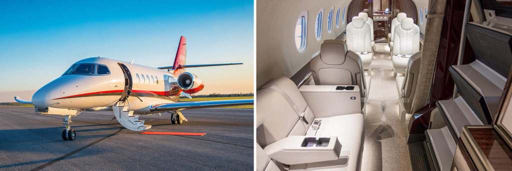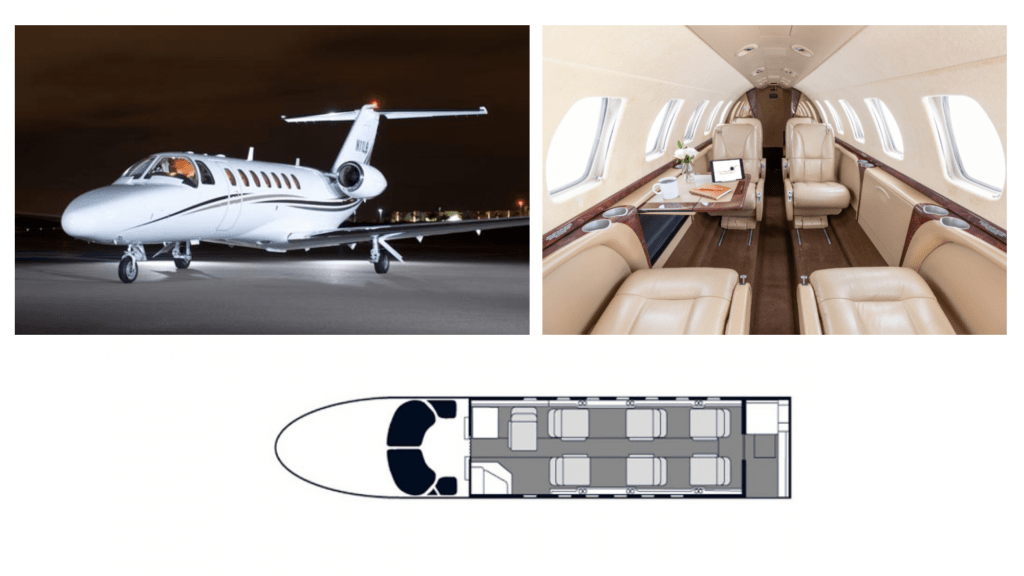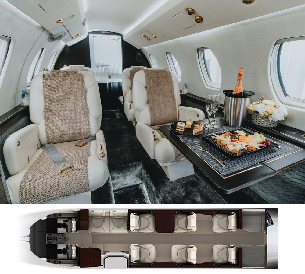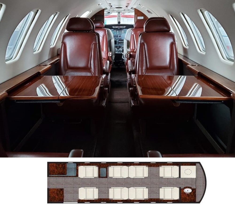 24. Vista interior y mapa de asientos del Cessna Citation VI.