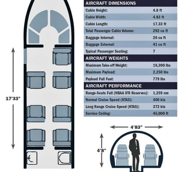 18. Mapa de asientos y dimensiones interiores del Cessna Citation Ultra.