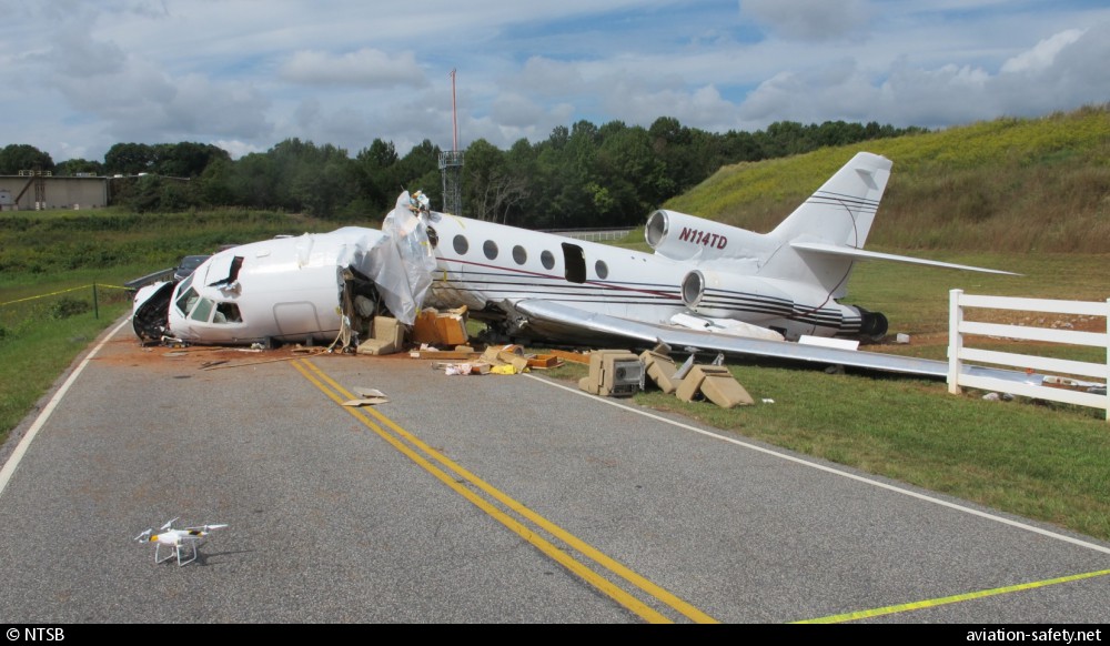El 27 de Septiembre de 2018 un Falcon 50 con registro N114TD, en vuelo privado entre el aeropuerto internacional de de St-Pete-Clearwater, en el estado norteamericano de Florida y el Aeropuerto de Greenville, en Carolina del Sur, en los EEUU., con 2 pasajeros y 2 tripulantes. Resultó siniestrado durante la toma de tierra del aparato en el aeropuerto de destino al fallarle los sistemas de frenado, aún cuando las reversas y aerofrenos estaban extendidos la aeronave se detuvo pasada la pista, quedando en el estado que vemos en la fotografía superior. Con el resultado de pronóstico leve para los 2 pasajeros y 2 tripulantes fallecidos. Investigaciones posteriores por la NTSB (National Transportation Safety Board), la autoridad norteamericana de investigación de accidentes detectaron una incorrecta puesta a punto del aparato después de una parada prolongada y un inadecuado manteni-miento.