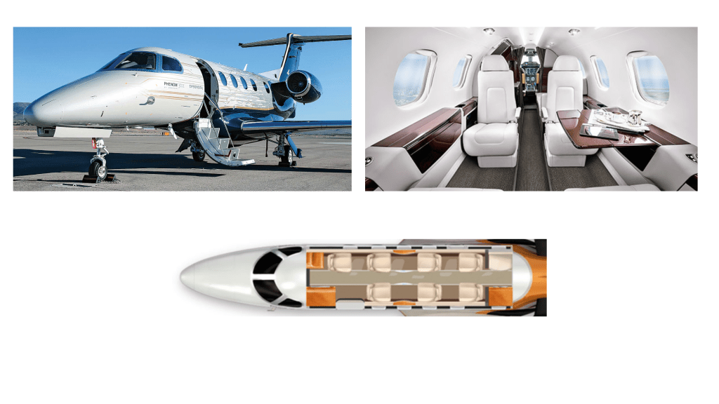 28. Vista exterior, interior y plano de asientos del Phenom 300.