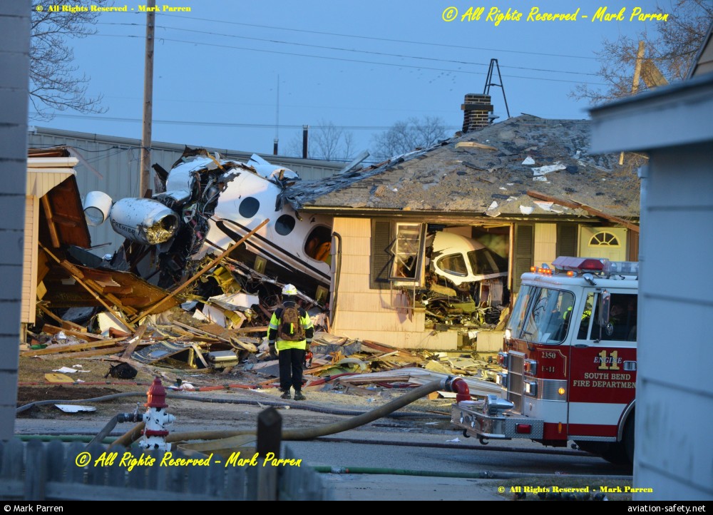 El 27 de Marzo de 2014 un Beechcraft 390 I con registro, N26DK, de Digicut Systems, con 4 ocupantes abordo en vuelo desde el aeropuerto Richard Lloyd Jones, en Tulsa, Oklahoma, EEUU, resultó siniestrado en el aeropuerto regional de South Bend, en el estado norteamericano de Indianápolis, durante la operación de toma de tierra, realizada por un pasajero, aprendiz de piloto, supervisado por el comandante de la aeronave. Segundos mas tarde el piloto informó de la pérdida total de potencia en las turbinas seguido de la ausencia de control hidráulico y sistemas de navegación, visualizando la pista asignada, 9R delante. La torre de control advirtió al piloto de que tan solo estaba extendido el tren frontal. Realizó un segundo intento de aterrizaje, desplomándose e impactando, esta vez, sobre una vivienda de un centro residencial a 1.000 de la pista asignada, con el resultado de la pérdida de 2 de los 4 ocupantes del aparato. Investigaciones posteriores confirmaron que la parada de ambos propulsores, fue realizada por la persona al mando en ese momento, concatenando las series de errores surgidos por la falta de potencia y electricidad a los distintos sistemas de la aeronave. Quedando en el estado que vemos mas arriba.