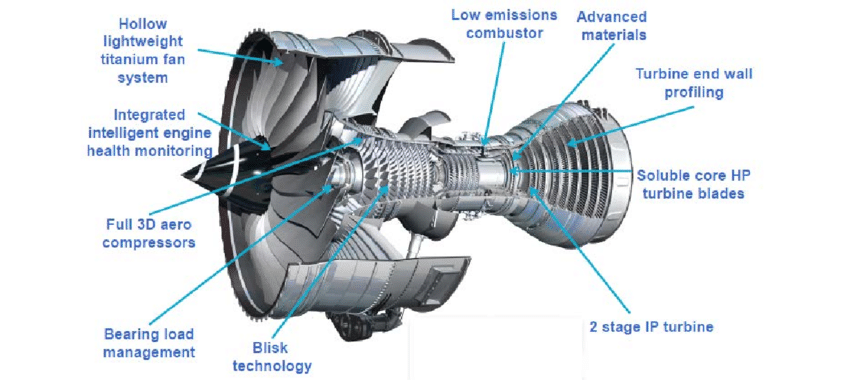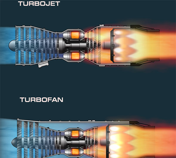 La creación del turboventilador se debe al importante ahorro de com-bustible y el mejor aprovechamiento de éste al reducir la velocidad de salida los gases en comparación con el turborreactor, del cual procede. Esta motorización es más potente, silenciosa y eficaz que cualquier turbo reactor, dado que en el interior de la góndola que cubre las turbinas cuen-tan con un material especifico para la reducción del ruido, y emisiones de CO2, cuyas restricciones son más estrictas cada año debido al deterioro del clima en el planeta, incluyendo los chevrones de los modelos de Boeing, instalados en los B-747-8I/F, B-787/8/9, B-737-8/9/10 Max y en el nuevo B-777X o los nuevos conos de las toberas de todos los modelos de Airbus, tal y como vemos en la imagen inferior.