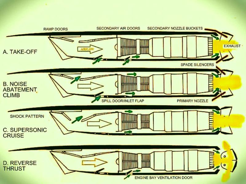 Este tipo de motor fue el propulsor de los 2 únicos aviones supersónicos comerciales del mundo. El franco-británico Concorde con su Olympus 593, fruto de la colaboración de los fabricantes de la misma nacionali-dad, Rolls-Royce y Snecma, derivado del Bristol Siddeley Olympus 22R y del soviético Tupolev Tu-144, propulsado por el Kuznetsov NK-144, am-bos con pos-quemadores. El motor anglo-británico desarrollaba una po-tencia de 160 kN en 1966. Las palas del compresor y su eje eran de tita-nio y una aleación de níquel conformaban las partes más calientes de la turbina, con una duración de 25.000 horas de vuelo para los componen-tes de la planta motriz, excepto para el compresor y sus palas que eran de 10.000. Las tomas de aire eran de geometría variable, según las dis-tintas fases de vuelo, tal y como vemos en la imagen superior e inferior.