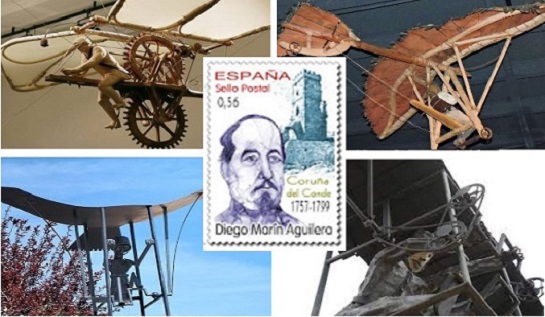 Entre las figuras relevantes de la aviación española se encuentra el in-ventor español Diego Marín Aguilera por haber cruzado el rio Arandilla, sito en la localidad, Coruña del Conde, en la provincia de Castilla y León, en un vuelo de entre 300 y 400 metros con un ornitóptero, el día 16 de Mayo de 1793, cuya imagen vemos más arriba.
