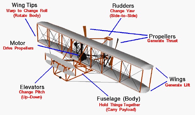 Sin embargo, Orvile y Wilbur Wright, mundialmente conocidos como los hermanos Wright, el 17 de Diciembre de 1903 realizaron el primer vuelo motorizado controlado de un aparato más pesado que el aire de 6 kiló-metros con su Flyer en Kitty Hawk, Carolina del Norte, cuya descripción vemos en la imagen superior, siendo considerados los padres de la avia-ción moderna. En 1904 presentaron el Flyer II y un año más tarde el Flyer III, introduciendo nuevas mejoras en cada uno de sus modelos, salidos de su propio túnel de viento, contribuyendo al desarrollo de la aeronáutica en distintas publicaciones técnicas de la época, incluso construyendo sus propias hélices.