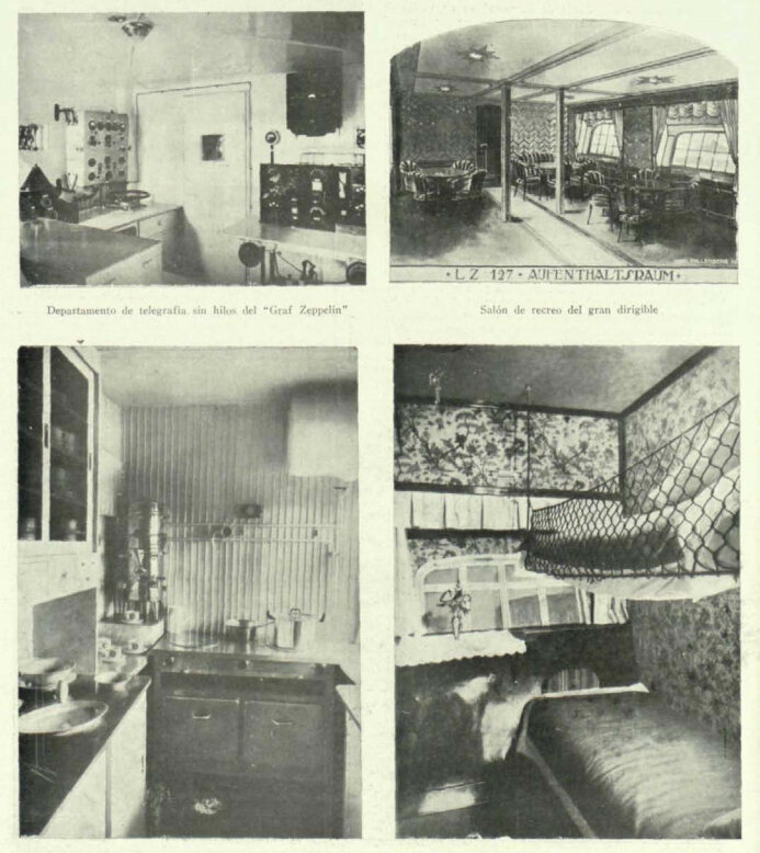 (10,6 kw). Realizando un vuelo de tan solo 18 minutos el 2 de Julio de 1900. El servicio de pasajeros conocido como DELAG, (DEutsche Lufts-chiffahrts AG) comenzó en 1910, que cruzaba en Atlantico desde Berlín a Nueva York, en tan solo 2 días y medio con literas, servicio de restau-ración y cafetería a bordo, como vemos en la imagen superior. Finalizan-do este servicio trágicamente durante el aterrizaje del Hindenburg en Nueva York el 6 de Mayo de 1937.