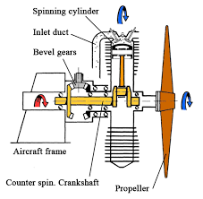 El motor rotativo es básicamente uno radial, pero en este caso el ci-güeñal se encuentra anclado en la estructura del aparato, de tal forma que éste y los cilindros giran al unísono, mientras que la hélice está fijada al motor directamente, tal y como podemos ver en el diagrama superior. Su principal ventaja es el flujo de aire constante que recibe de las palas de las hélices y como consecuencia una refrigeración por aire de forma natural, especialmente a bajas velocidades. El primer ejemplar fue el Gnome Omega, diseñado por los hermanos Seguin, realizando su vuelo inaugural en 1909.