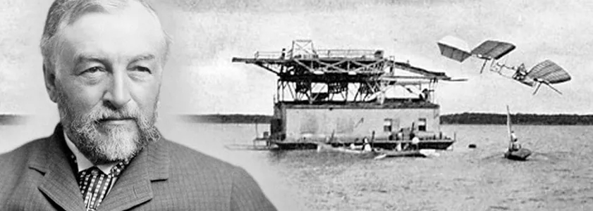 El 6 de Mayo de 1896, su Aerodrome 5 realizó su primer vuelo motori-zado, sin piloto, catapultado desde su centro de pruebas del Potomac, que vemos más arriba. Ese día se realizaron dos vuelos, uno con un re-corrido de 1.005 metros y un segundo de 700 metros, a una velocidad aproximada de 40 km/h. El 28 de Noviembre, su Aerodrome 6, realizó un vuelo sin piloto de 1.460 metros, fotografiado por Alexander Graham Bell, como testigo. Después de los éxitos conseguidos con los dos últi-mos vuelos, comenzó a desarrollar aparatos capaces de transportar un piloto para realizar labores de reconocimiento aéreo, consiguiendo una subvención gubernamental de 50.000 Dólares para desarrollarlo, debi-do al comienzo de la Guerra Hispano Norteamericana. Consiguiendo su objetivo el 18 de Junio de 1901 y con un motor mas potente en 1903.