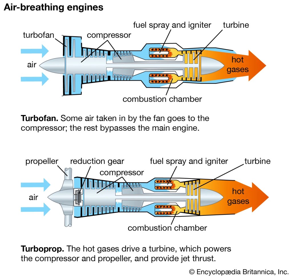 38. Diferencias entre un turbo ventilador, arriba y un turbo hélice, abajo.