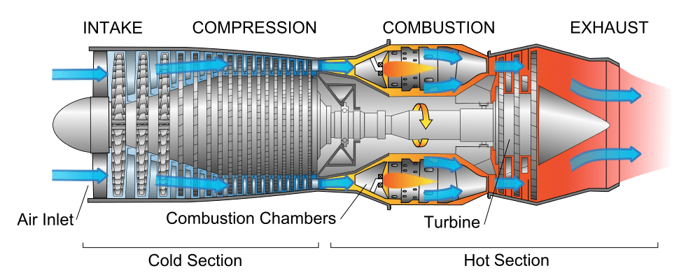 El turbojet o turborreactor, es un motor a reacción con una toma de aire en su parte frontal con palas giratorias conectadas a un eje, una zona de compresión del aire integrado por palas fijas y giratorias que envían el aire comprimido a la cámara de combustión donde se mezcla con el com-bustible, cuyo aire caliente se envía a la turbina, integrada por varios ála-bes giratorios, refrigerados por aire o agua, que se convierte en energia mecánica, cuyos gases son expulsados al exterior por las toberas y mue-ve el compresor, tal y como vemos en la imagen 47
