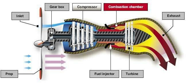 Un turboprop, o turbo hélice, es básicamente una turbina de gas que mueve una hélice. Tal y como vemos en el esquema superior, consta de una hélice, una caja de cambios una toma de aire, un compresor, una cámara de combustión, una turbina y finalmente una salida para los gases de escape. El aire entra por la toma del aire, situada detrás de la hélice, se comprime, el combustible se inyecta pulverizado en la cámara de combustión, la turbina comprime la mezcla, generando la potencia necesaria para la propulsión del aparato y el movimiento de los genera-dores eléctricos para la iluminación, aire acondicionado y otros sistemas eléctricos de la aeronave, liberando los gases a través de los tubos de escape.