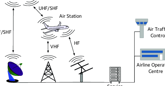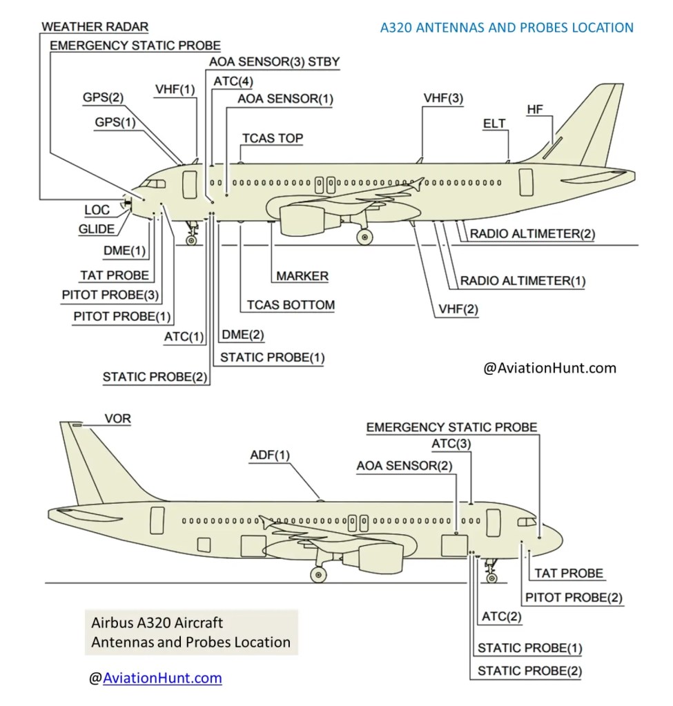 En la imagen superior, vemos la situación y nombre de las antenas, cuya información es monitoreada en la cabina de pilotaje y cuya mayoría de datos son enviados a los ordenadores centrales del seguimiento de vuelos de cada compañía. El sistema de comunicacion aéreo en VHF, (Very High Frecuency), tiene lugar en la frecuencia de entre 118.000 kHz a los 136.975 kHz. Cada canal está espaciado en 8,33 kHz en Europa y 25 kHz para el resto del mundo, es utilizado para comunicarse entre aparatos y el control aéreo. La HF, (High Frecuency), también se utiliza en los vuelos transoceánicos, al igual que la satelital.