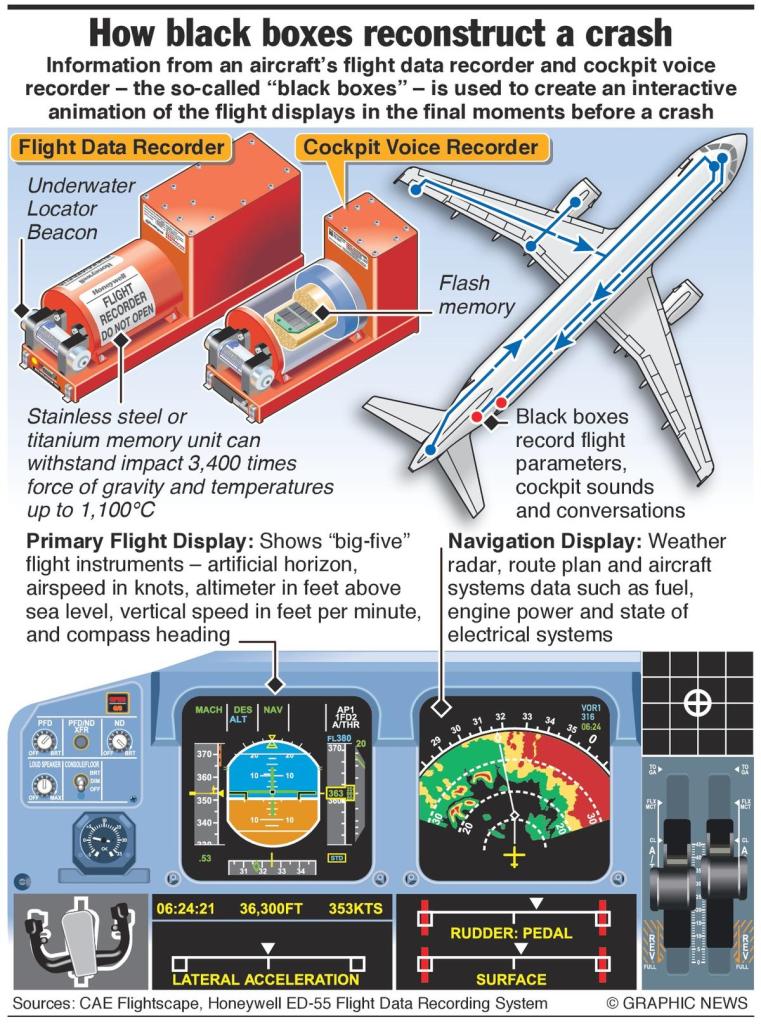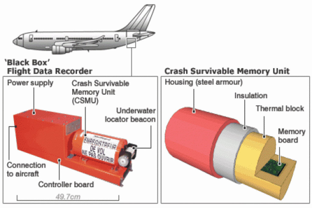 Todas las aeronaves comerciales, de negocios y militares disponen de 2 cajas negras. La FDR, (Flight Data Recorder), en la que se recogen todos los datos del aparato, como, la altitud, velocidad, posición de todos los controles, estado de motores etc, puede llegar a registrar hasta 25 horas de datos de vuelos y gran cantidad de parámetros, según el modelo ins-talado. Y la CVR, (Cockpit Voice Recorder), que graba todas las conver-saciones de los pilotos dentro de la cabina de vuelo, comunicaciones con tierra y control aéreo, alarmas y sonidos del entorno. Graba continua-mente en bucle las 2 últimas horas del vuelo, aunque existen algunas más antiguas que tan solo captan 30 minutos. Se encuentran instaladas en la parte trasera del aparato tal y como vemos en el esquema superior.