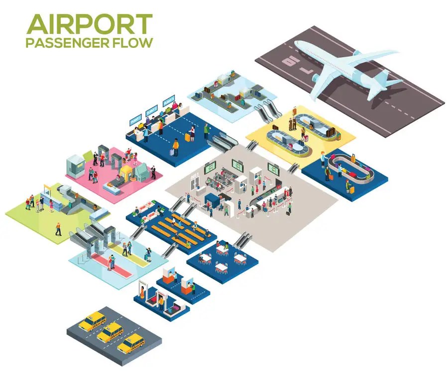 El flujo de los pasajeros a su llegada es el mostrado en la parte superior de la imagen, también conocido como landside, o lado tierra, situado en la planta baja del aeropuerto, donde encontramos el control de pasapor-tes, seguido de la zona de recogida del equipaje que es descargada de las aeronaves, las aduanas y la salida a la terminal de llegadas del aero-puerto, con acceso a los aparcamientos, servicios de taxi y recogida de pasajeros.