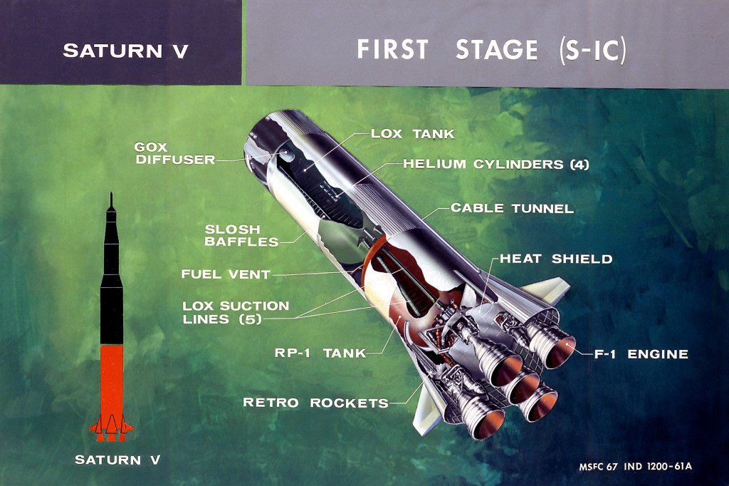 28. Primera fase, (S-IC) del cohete Saturno V.